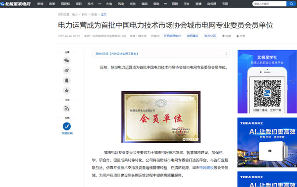 日前,陜投電力運(yùn)營成為首批中國電力技術(shù)市場協(xié)會城市電網(wǎng)專業(yè)委員會員單位。